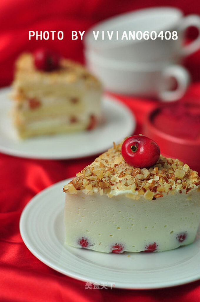23. Refrigerate for more than four hours. Then sprinkle with crushed almonds and decorate with two small cherries.